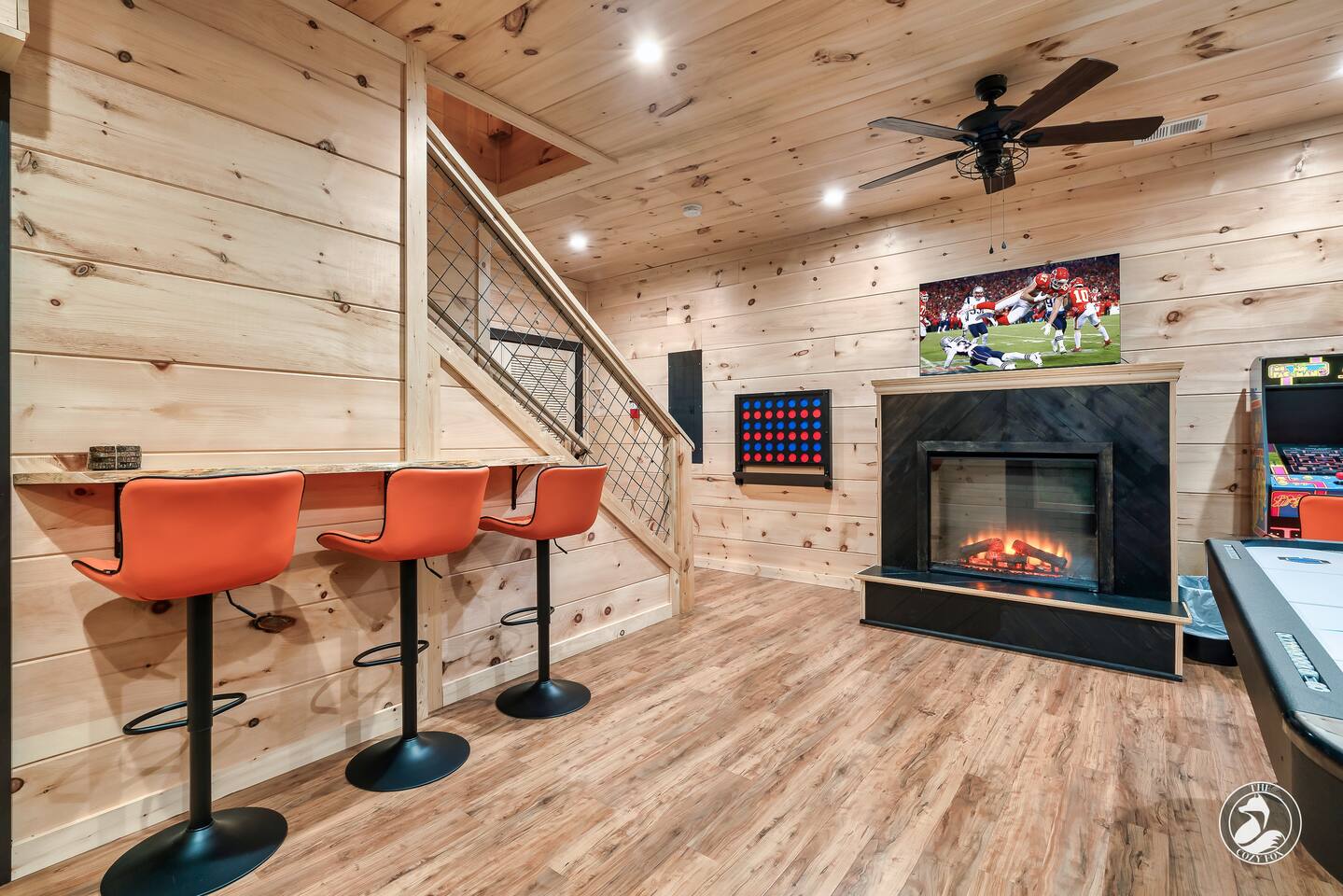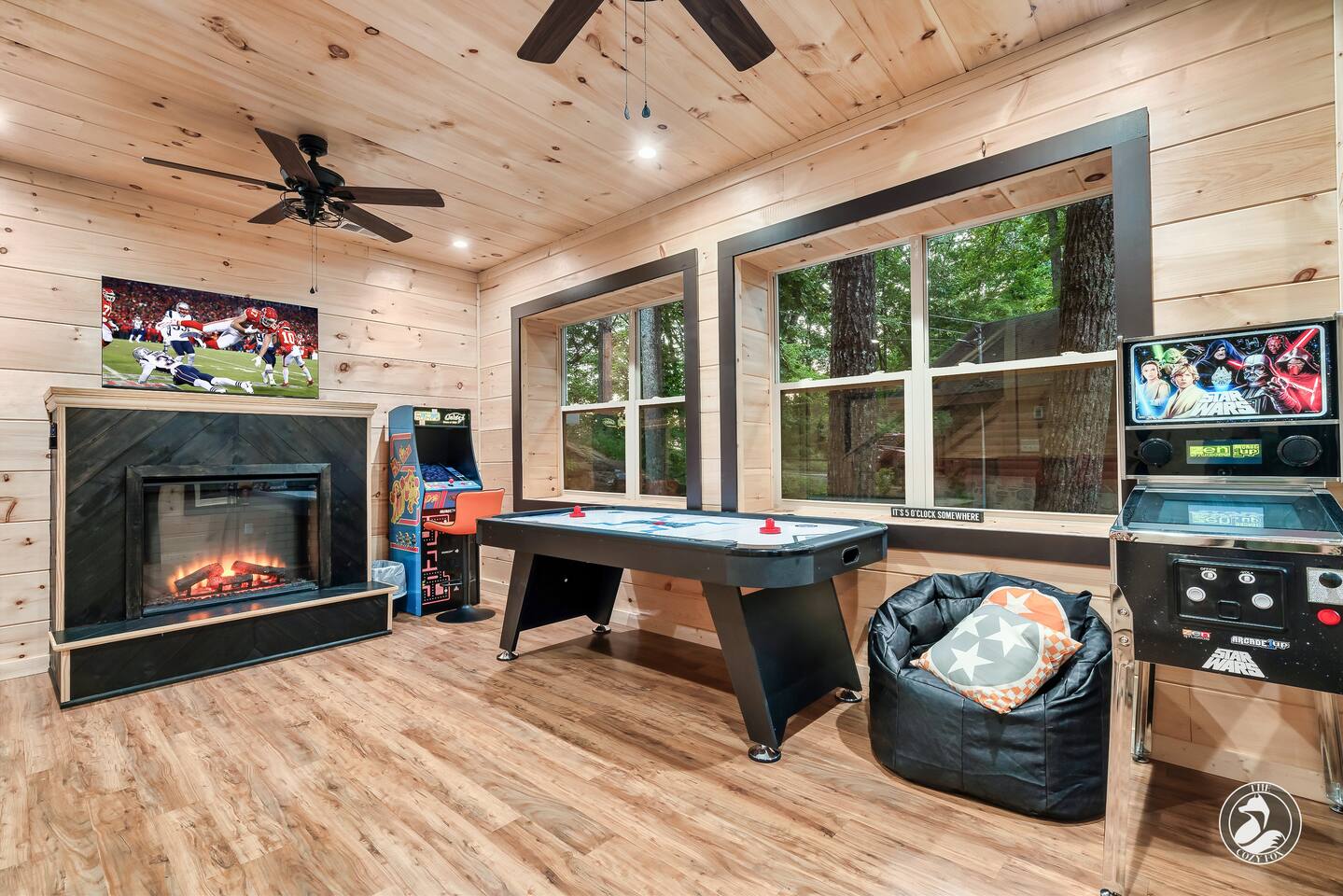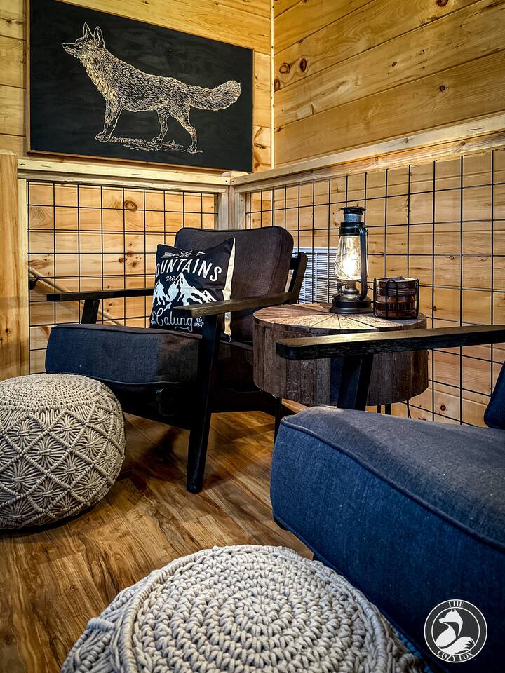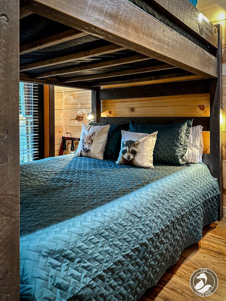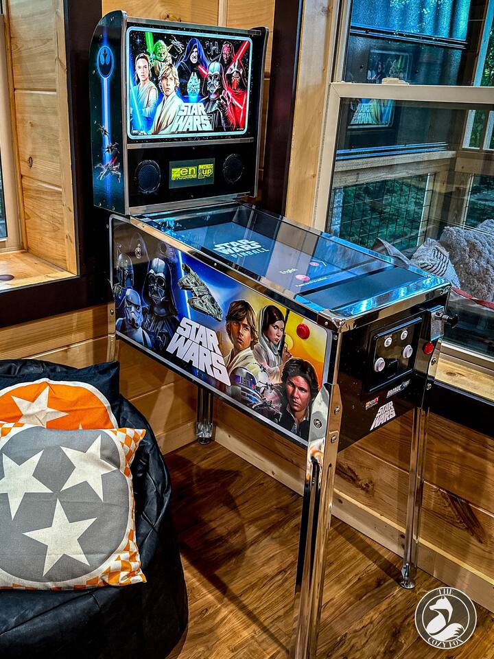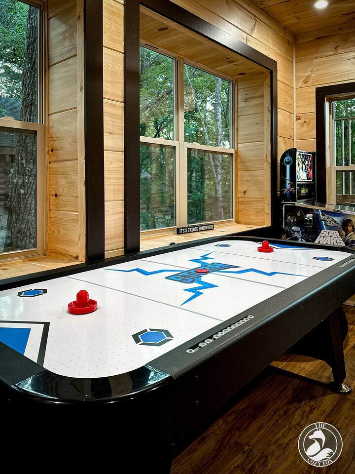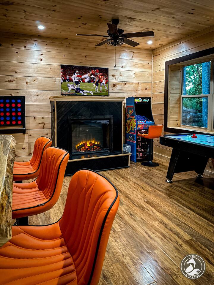 โ๏ธ The Cozy Fox ๐ฆ sleeps up to 8 โ๏ธ A true mountain cabin immersed in a magical forest ambiance โ๏ธ 100% paved roads with paved parking for 3 vehicles โ๏ธ Superb location โ๏ธ Cable TV with Sports Package ๐โพ๏ธ ๐ โ๏ธ 2 private bedrooms - each with an ensuite bathroom (featuring a custom tiled shower), a Smart TV, + Deck Walkout โ๏ธ Minimum recommended age is 4yrs (no bathtubs at The Cozy Fox) โ๏ธ King bed (sleeps 2) and a queen memory foam sleeper sofa (sleeps 2) on main level โ๏ธ Queen over queen bunk on lower level (sleeps 4) โ๏ธ Luxurious white hotel quality linens and plush bath towels provided, plus hot tub towels ๐ฆ โ๏ธ Fully-equipped kitchen for all of your cooking/baking needs โ๏ธ Coffee Station with a complimentary starter supply โ โ๏ธ Filtered water and ice ๐ง, plus whole-house water filtration โ๏ธ Weber BBQ grill and seating for four on the large front porch (we provide the propane๐) โ๏ธ High Speed WiFi โ๏ธ Sonos Soundbars โ๏ธ Ultimate Game Room with Star Wars pinball, Mrs. Packman & Galaga arcade, air hockey, bar table, fireplace, Roku TV, board games and jumbo Connect 4! โ๏ธ Upper Deck (covered): 4 person hot tub, dining table (dine outdoors rain or shine!) โ๏ธ Lower Deck (covered): relaxing daybed swing, fire table and couch (we provide the propane๐) โ๏ธ Large windows and two skylights for natural lighting โ๏ธ Washer & Dryer with Iron/Ironing Board โ๏ธ The Cozy Fox ๐ฆ Exclusive! Our Digital Guidebook is filled with tips for maximum area enjoyment (NEW! We just added our recommendations for local eateries - location links included and most are only a 10-20 min drive!) โ๏ธ EV charger (50 amp/level 2)๐๐ ๐ PRIME LOCATION: located 1/2 way between Pigeon Forge and Gatlinburg, only 1.7 miles from the strip! โ 7..3 miles to Titanic Museum ๐ข โ 6.5 miles to Dollywood ๐ข ๐ฆ โ 5.9 miles to The Island Pigeon Forge ๐ก โ 6.2 miles to Anakeesta in Gatlinburg ๐ณ โ 6 miles to The Ripken Experience Sports Complex โพ๏ธ